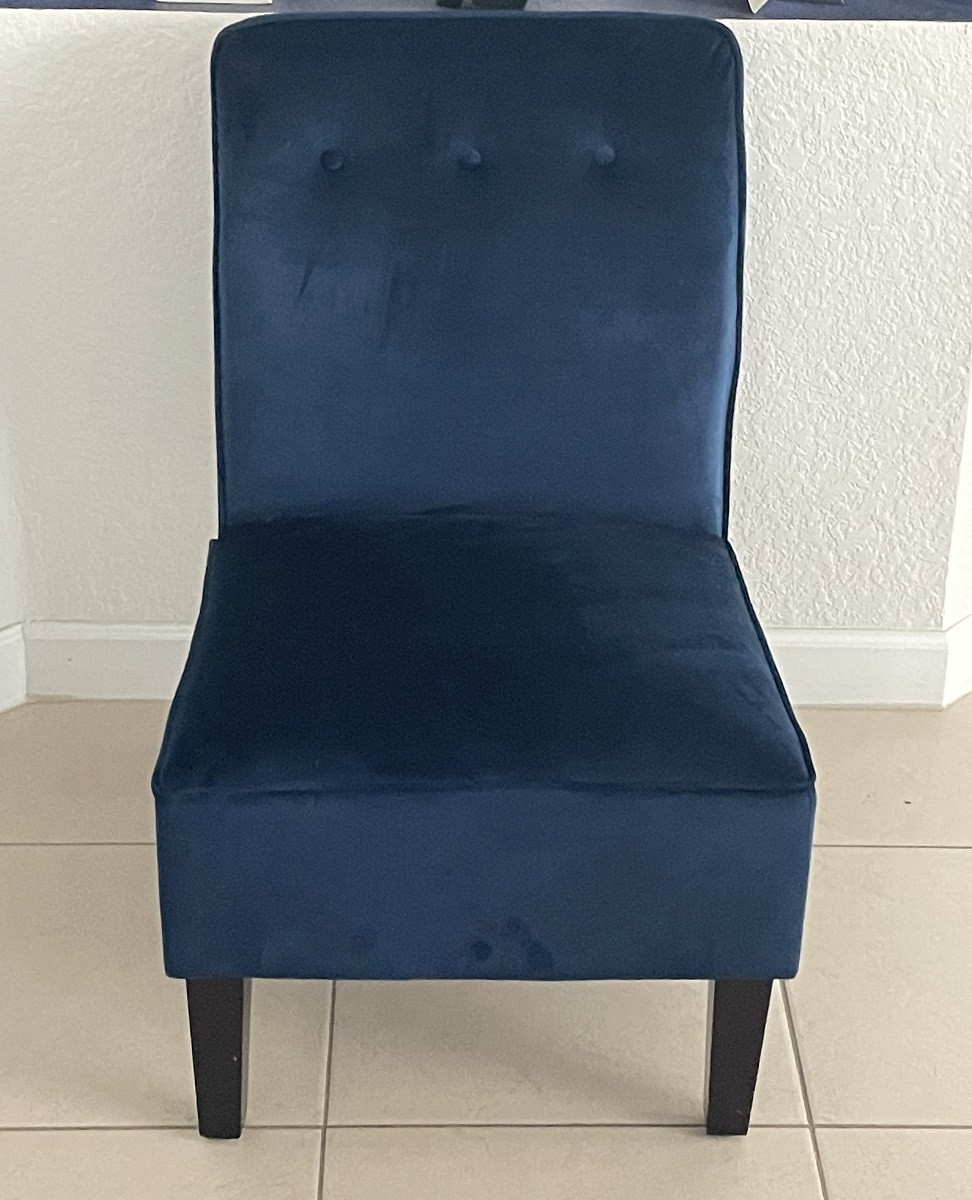 We carefully unpacked the Modern Velvet Armless Accent Chair in Navy Blue. All parts, including the seat frame, backrest, legs, hardware, and assembly tools, were inspected to ensure nothing was missing or damaged. The assembly process began with attaching the chair’s solid wood legs securely to the underside of the velvet-upholstered seat base using the provided bolts and washers. Once tightened, the backrest was aligned and fastened to the seat frame, ensuring stability and proper positioning. Each connection was checked for firmness, and the chair was leveled to prevent wobbling.