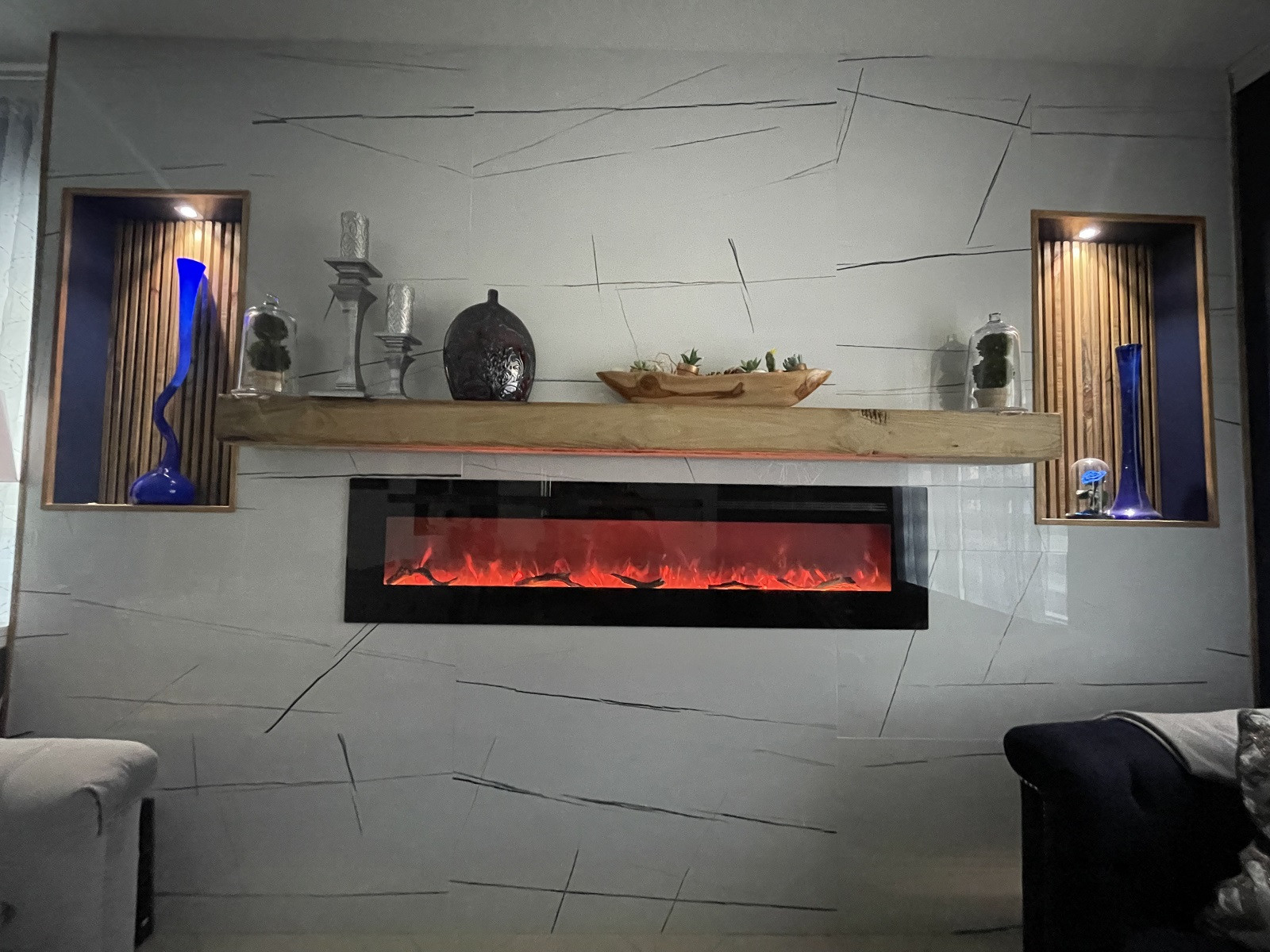 The finished wall integrates luxury materials, functional shelving, soft lighting, and a statement fireplace, transforming the space into a sophisticated and comfortable living area tailored to the customer’s vision.