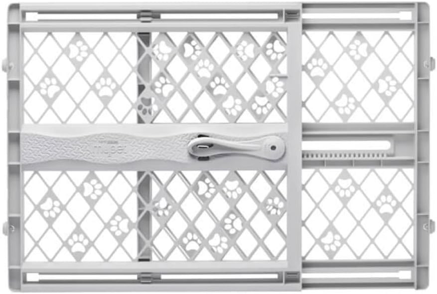 Worry-Free Safety: Our expandable dog gate is great for doorways and blocking off other indoor spaces to keep your pet safe and secure. This durable puppy gate is made of strong, appealing light gray plastic with adorable paw print accents.