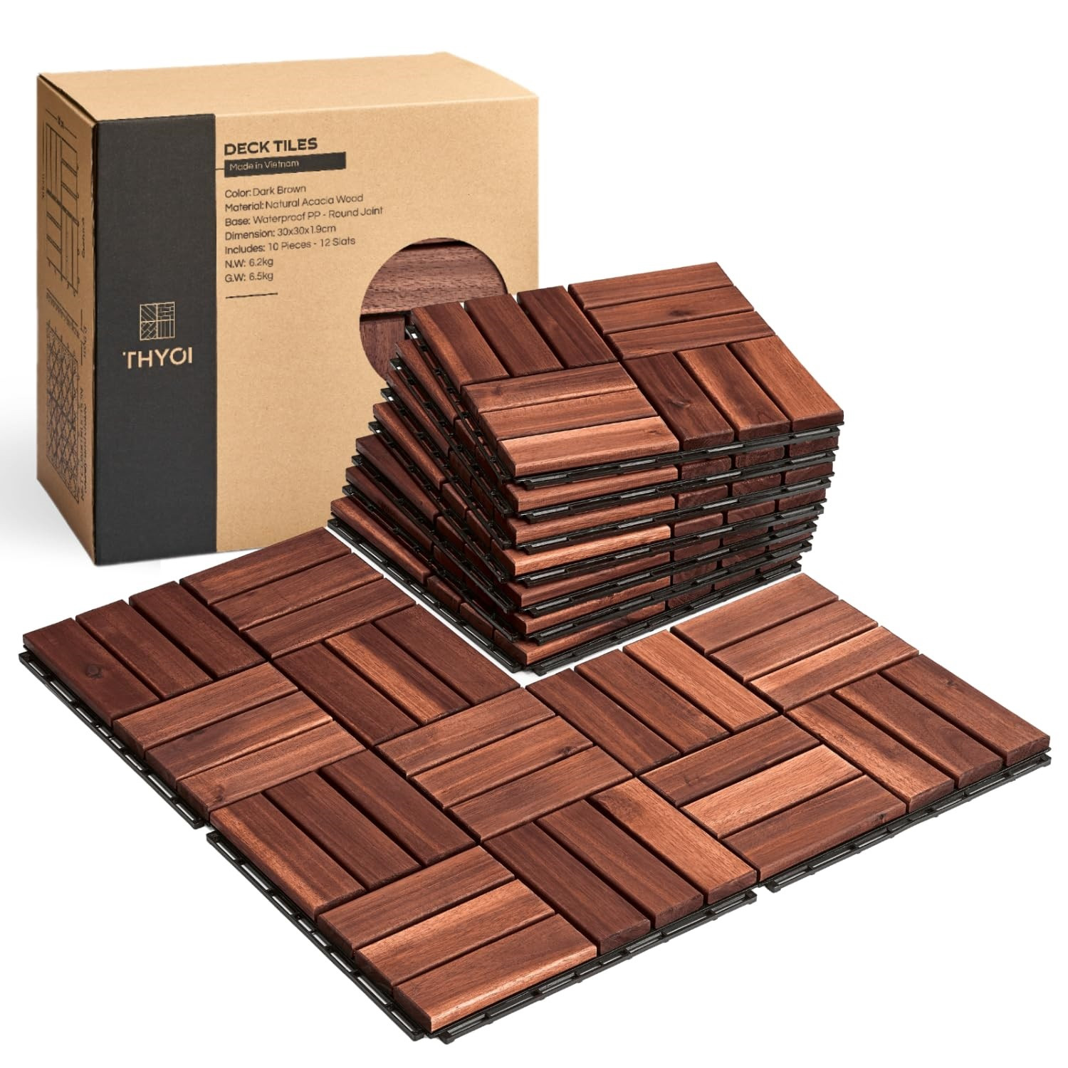 - Thyoi 10 pcs-10 sq ft Acacia Wood Deck Tiles, Dark Brown Crossed Pattern