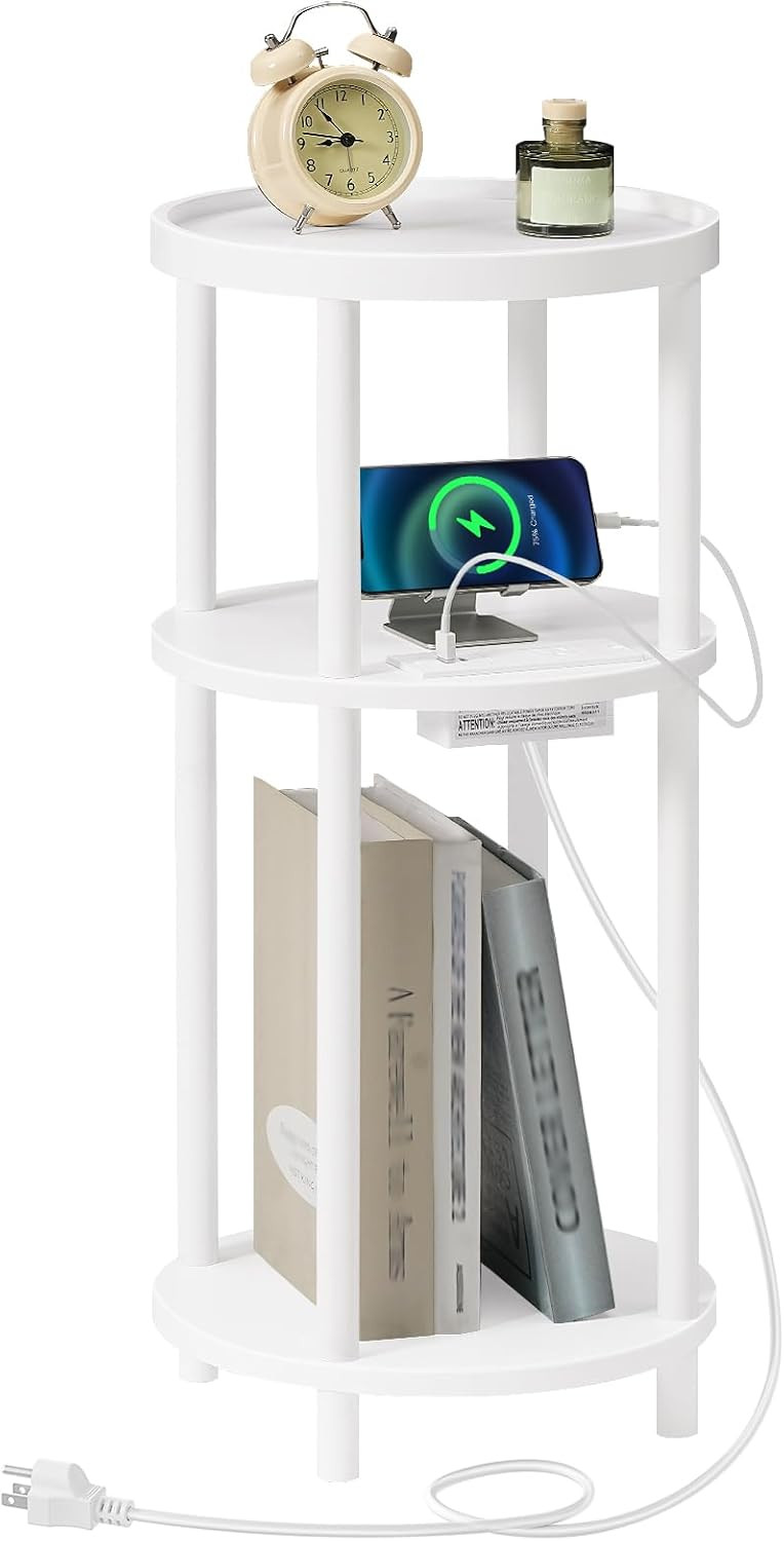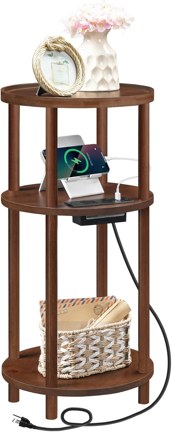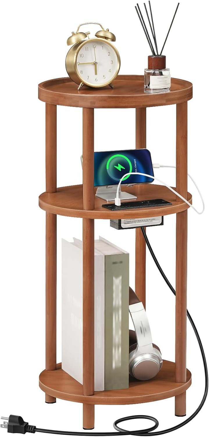 HOOBRO Small Round Side Table with Charging Station, 3-Tier Round Bamboo End Table, Compact Sofa Bedside Table for Small Space, for Living Room, Bedroom, Apartment