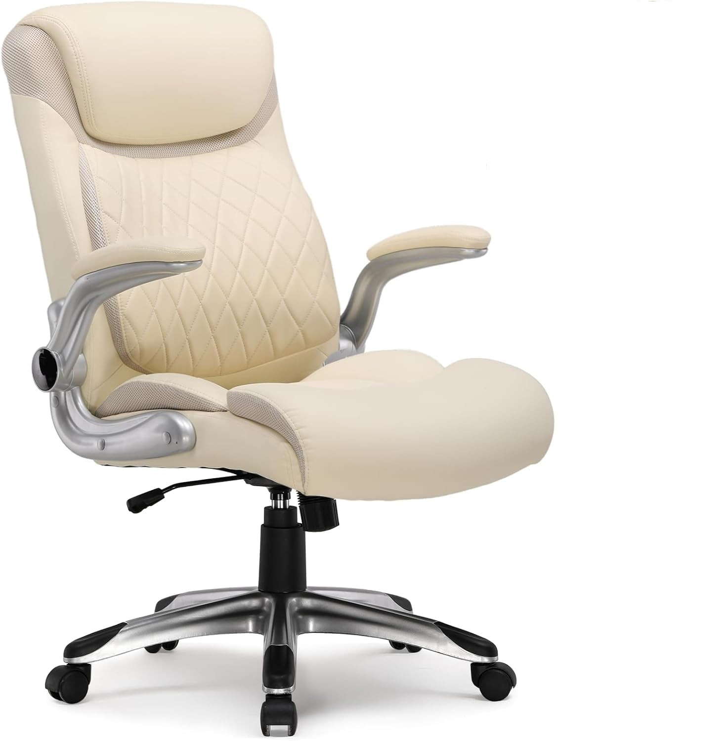 Adjustable Features: Pneumatic seat height adjustment, 20°tilt, 90° flip-up armrests, and 360° swivel. Able to rock back 135° to help you relax. With the foldaway arms, the executive chair can easily slide under a desk for space-saving. Adjustability options allow you to customize the perfect setting to fit your body comfortably.