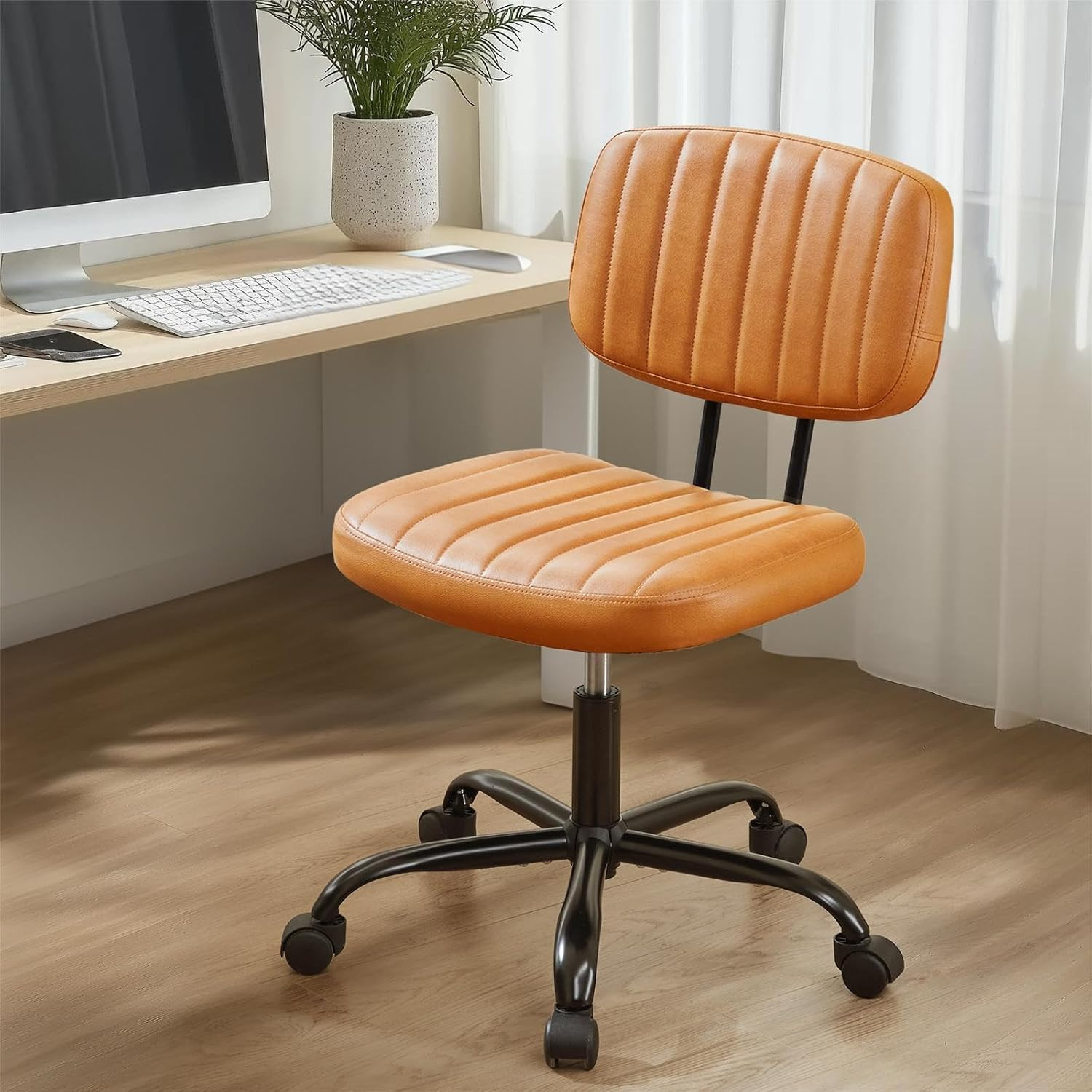 Sweetcrispy Small Office Desk Chair - Armless PU Leather with Comfy Lumbar Support, Height Adjustable Rolling Swivel Task for No Arms, for Adult, Student, Bedroom, Home, Vanity