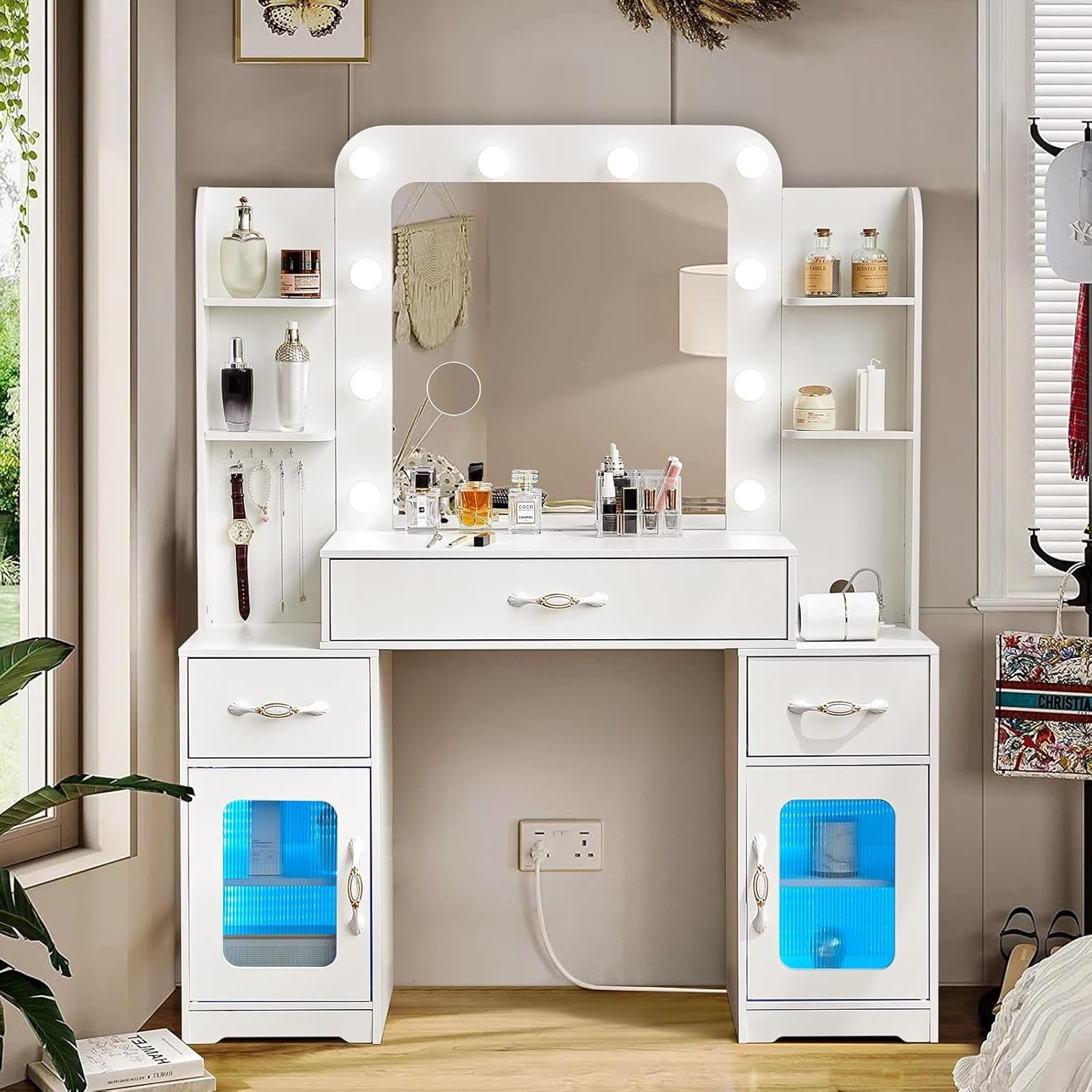 Ample Storage Space Vanity Set: This vanity desk features 3 large drawers and 2 RGB storage cabinets with adjustable shelves, 3 open shelves, and 8 jewelry hooks. It is an ample multi-functional vanity organizer that is perfect for storing precious lipsticks, eye shadows, makeup, perfumes, jewelry, and other beauty supplies. Measuring 44.88"W*15.75"D*55.32" H