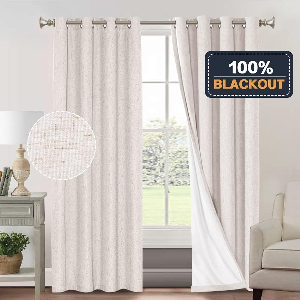 FAUX LINEN TEXTURE: These blackout curtains are crafted from linen look fabric (100% polyester) with pure white flocking backing. Burlap effect will bring more contemporary and farmhouse visual look, create a relaxed and warm home environment